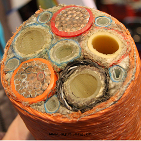 如(rú)左(zuǒ)側的(de)救生鐘(zhōng)主(zhǔ)缆(lǎn)是(shì)为(wèi)国內(nèi)救生鐘(zhōng)提(tí)供,9个(gè)气(qì)管(guǎn)+2组電(diàn)缆(lǎn)信(xìn)号(hào)缆(lǎn)。內(nèi)管(guǎn)最大(dà)能(néng)耐3000psi的(de)壓力,電(diàn)缆(lǎn)導体的(de)電(diàn)壓最高(gāo)可(kě)达(dá)3000VAC。